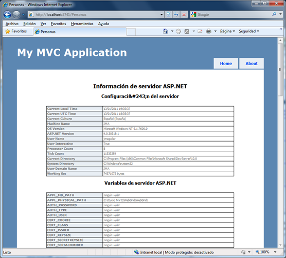 El resultado será un contenido HTML maquetado de forma que pueda apreciarse muy claramente el contenido del objeto. En la siguiente captura de pantalla se observa el resultado, teniendo en cuenta que hemos enviado al helper un objeto que contiene un enumerable de Personas :